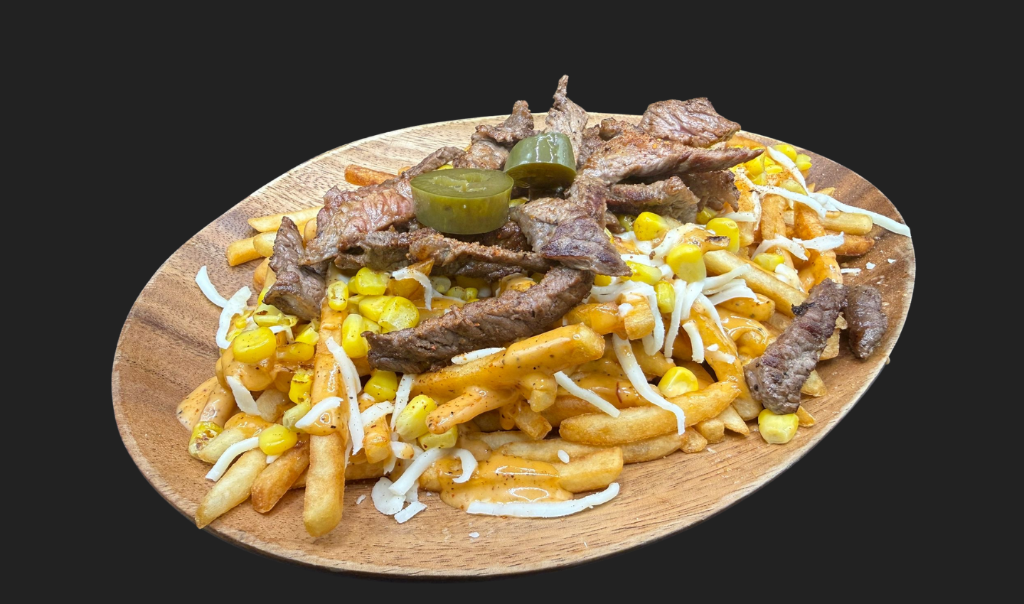 crispy fries | 4oz grilled carne asada | charred corn | jalapeño | cotijacheese | chipotle aioli | tajín & lime